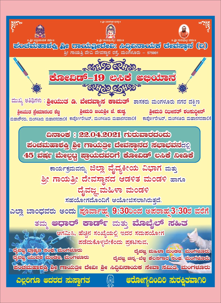 ಮಂಗಳೂರು: ಜಿಲ್ಲಾ ವೈದ್ಯಕೀಯ ವಿಭಾಗ ಮತ್ತು ಶ್ರೀ ಗಾಯತ್ರಿ ದೇವಸ್ಥಾನದ ಆಡಳಿತ ಮಂಡಳಿ ಹಾಗೂ ದೈವಜ್ಞ ಮಹಿಳಾ ಮಂಡಳಿ ಸಹಯೋಗದೊಂದಿಗೆ ಕೋವಿಡ್-19 ಲಸಿಕೆ ಅಭಿಯಾನ ಎಪ್ರಿಲ್ 22ರಂದು ಗುರುವಾರ ನಗರದ ಪಂಚಮಹಾಶಕ್ತಿ ಶ್ರೀ ಗಾಯತ್ರಿದೇವಿ, ಸಿದ್ಧಿವಿನಾಯಕ ದೇವಸ್ಥಾನದ ಸಭಾಭವನದಲ್ಲಿ ಜರಗಲಿರುವುದು.