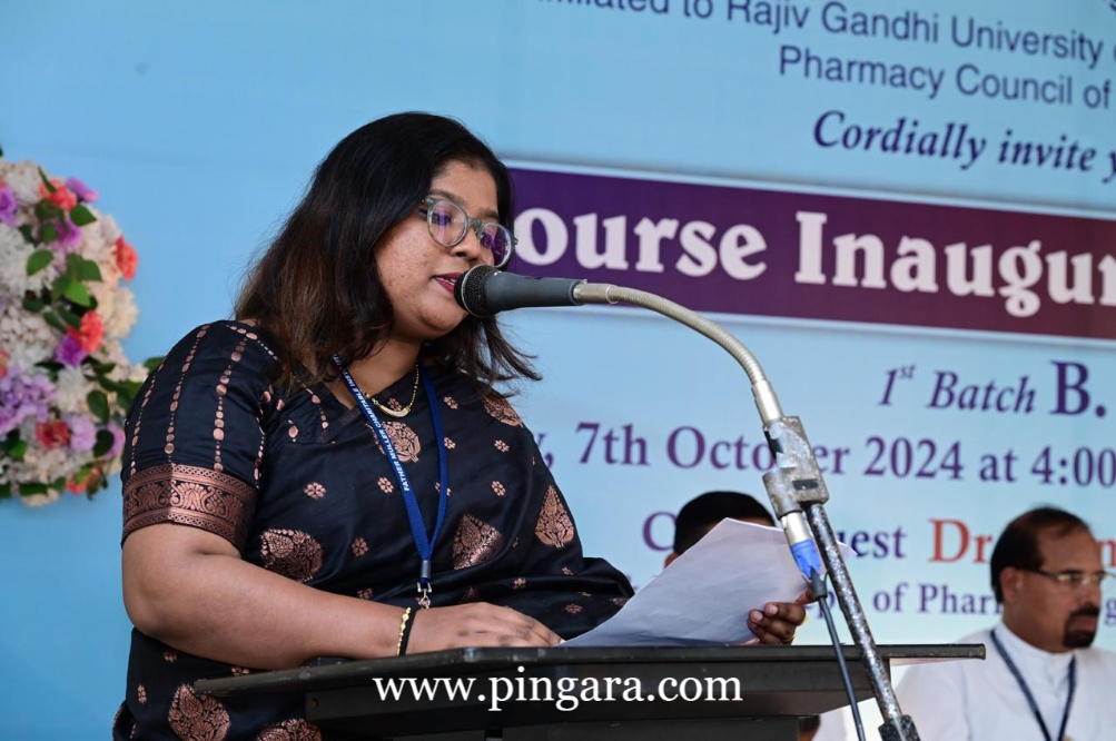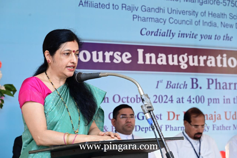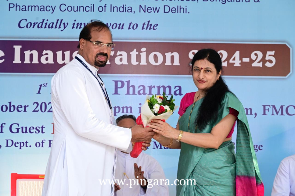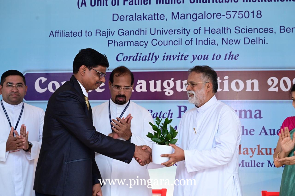 The Chief Guest, Dr. Padmaja Udaykumar, Professor & HOD, Department of Pharmacology, Father Muller Medical College, Mangalore, in her address, praised the relentless efforts of Dr. Narayan Swamy and Dr. Rajesh were instrumental in turning the dream of the pharmacy college into a reality. She encouraged the new batch of students, expressing that being part of the first cohort was a rare privilege and an opportunity to lay the foundation for a legacy. Her message to parents was one of reassurance, emphasizing that their children were on the right path and would flourish in the hands of Father Muller’s educational framework.