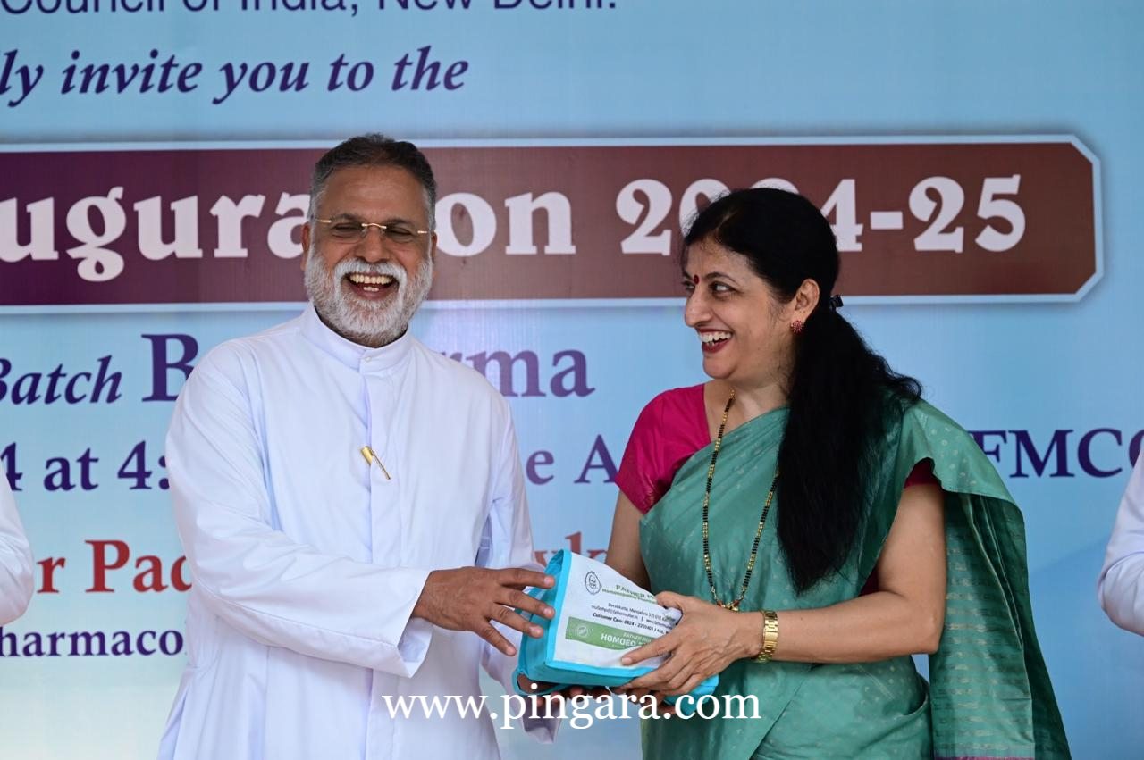 Dr. Satish S, Principal FMCOPS, welcomed the gathering with insightful remarks about the ever-growing pharmaceutical sector in India, which is ranked third globally. He emphasized FMCOPS's unique advantage of hands-on experience for the new students in pharmaceutical production through the institution's Homeopathic Production Division, making it a pioneering initiative in South Canara.