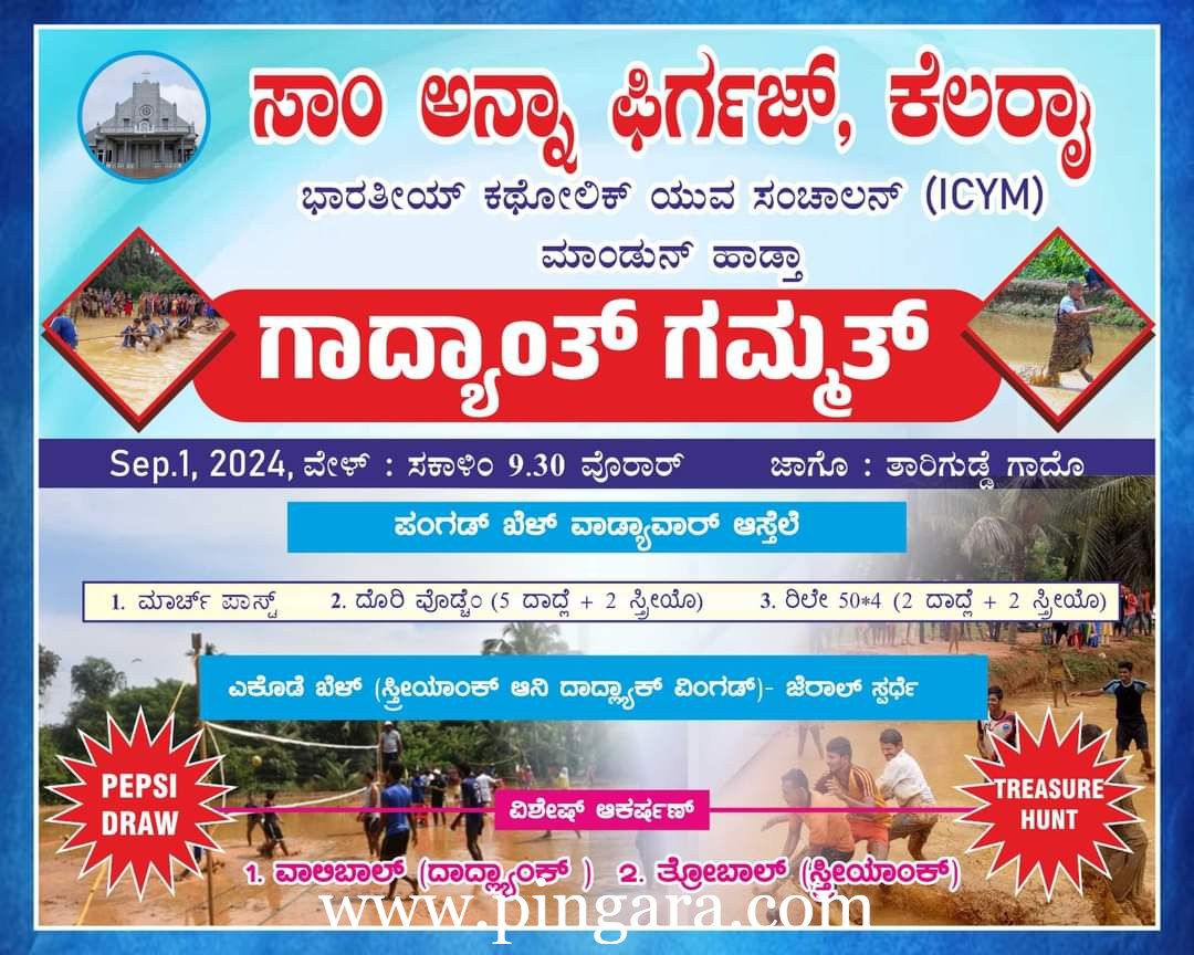Mangalore: The 'Indian Catholic Youth Movement' of St. Anna Church, Kelarai organized a program called "Gaadyant Gammat" (Fun in the Fields) on Sunday, September 1st, at Kelarai Tharigudde Fields. The event was inaugurated at 9:30 AM with a blessing by the parish priest, Fr. Silvester D'Costa. ICYM coordinator Vinod Periera, Church Managing Committee Vice President Santosh D'Costa, Secretary Celine D'Mello, Fr. Roshan Fernandes, Corporator Raghu Salian, and Jayanthi Devas were among the dignitaries present on stage who lit the lamp to inaugurate the event. The event was enriched by the cooperation of people from all religions.