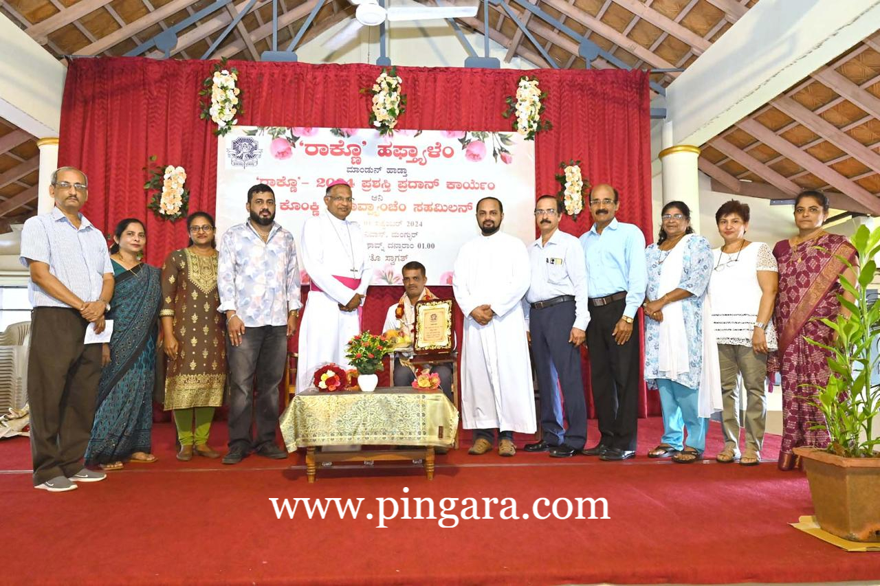 Mangalore: Lavi Ganjimat a renowned Konknni writer and 'Amche Sheth' Parish magazine from St Joseph church Bajpe were awarded 'Raknno Sahithi Prashasthi -2024' and 'Raknno Athyuththam Firgoz Pathr Prashasthi -2024' respectively in the forenoon on 1 September 2024 here at Mangalore Bishop House Hall. The Bishop of Mangalore Most Rev. Dr Peter Paul Saldanha, presented the awards which are first of their kind, along with Raknno Editor Rev. Rupesh Madtha.