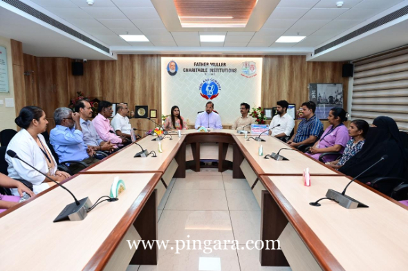 Mangaluru, Oct 4: The trustees of the G. Shanker Trust, led by Shamili, daughter of Nadoja G Shanker visited Father Muller Charitable Institutions (FMCI) on 4th October 2025 to extend healthcare aid to patients suffering from cancer and kidney ailments. The delegation was warmly received by Rev. Fr Faustine Lucas Lobo, Director of FMCI, who offered his blessings and appreciation for the Trust’s benevolent service to humanity.