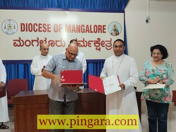 Mangalore – Renowned NRI entrepreneur and philanthropist Michael D’ Souza unveiled his ambitious Vision 2030 initiative aimed at empowering communities in the twin Dioceses of Karwar and Gulbarga through sustainable shelter and education programs. The event marked the signing of a Memorandum of Understanding (MoU) with the respective Bishops at Bishops House, Kodialbail, Mangalore, in the presence of Bishop Peter Paul Saldanha of Mangalore and Bishop Gerald Isaac Lobo of Udupi.