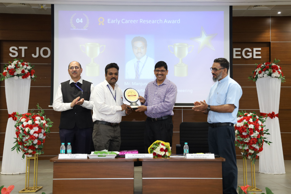 Early Career Research Award: Encouraging promising researchers in the early stages of their careers, the Early Career Research Award was presented to Manjunath B, Assistant Professor, Department of Civil Engineering. This award recognizes significant research contributions in indexed journals and conferences.